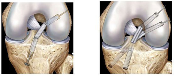 Para fixar o enxerto no osso são feitos dois túneis, um no fêmur e outro na tíbia. O enxerto é passado pelos túneis e sua fixação provisória pode ser feita com dispositivos como placas, parafusos e botões, evitando que o enxerto afrouxe até cicatrizar. A fixação final do enxerto ocorre entre 2 e 4 meses após a cirurgia, quando há a proliferação óssea dentro dos túneis.